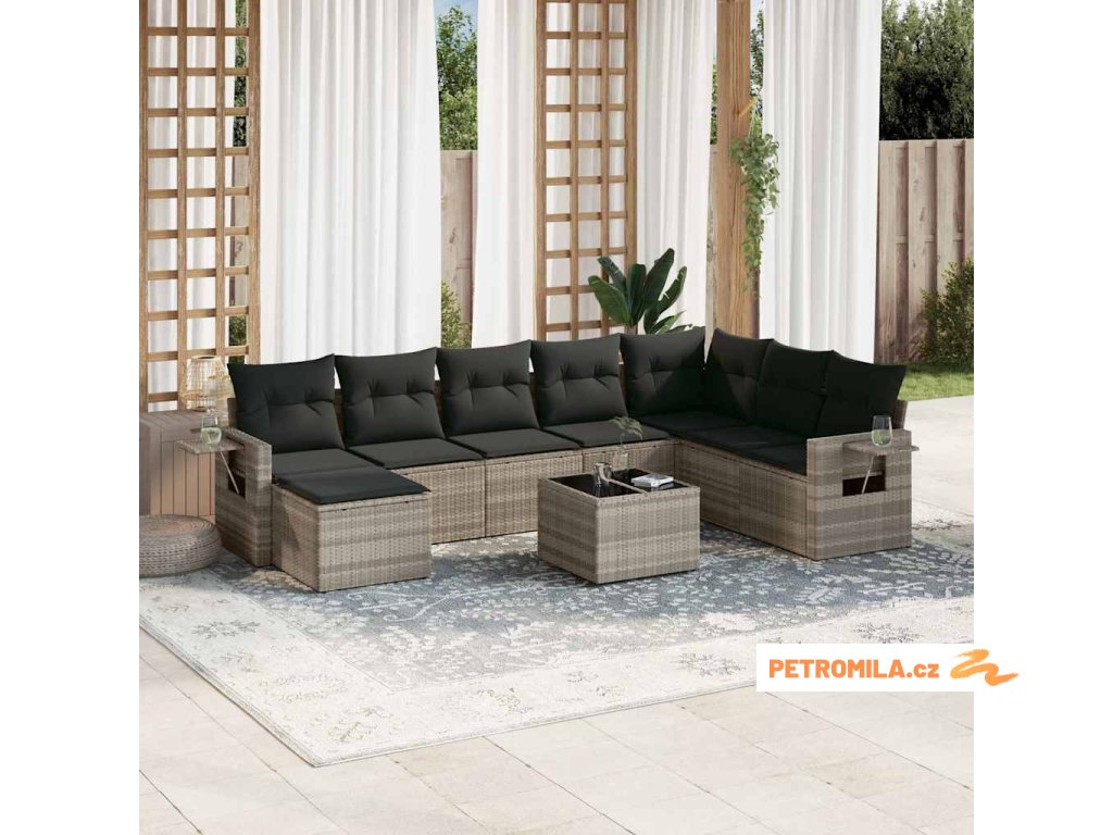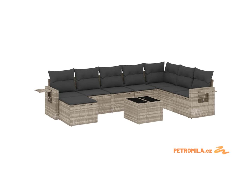 9dílná zahradní sedací souprava a podušky světle šedá polyratan