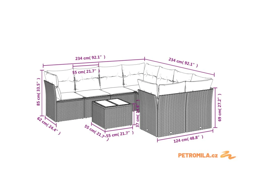 - Celkové rozměry pohovky: 234 x 234 x 69 cm (Š x H x V)
