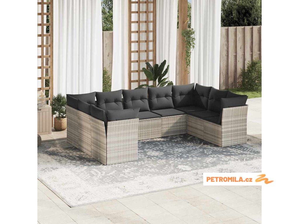 9dílná zahradní sedací souprava a podušky světle šedá polyratan