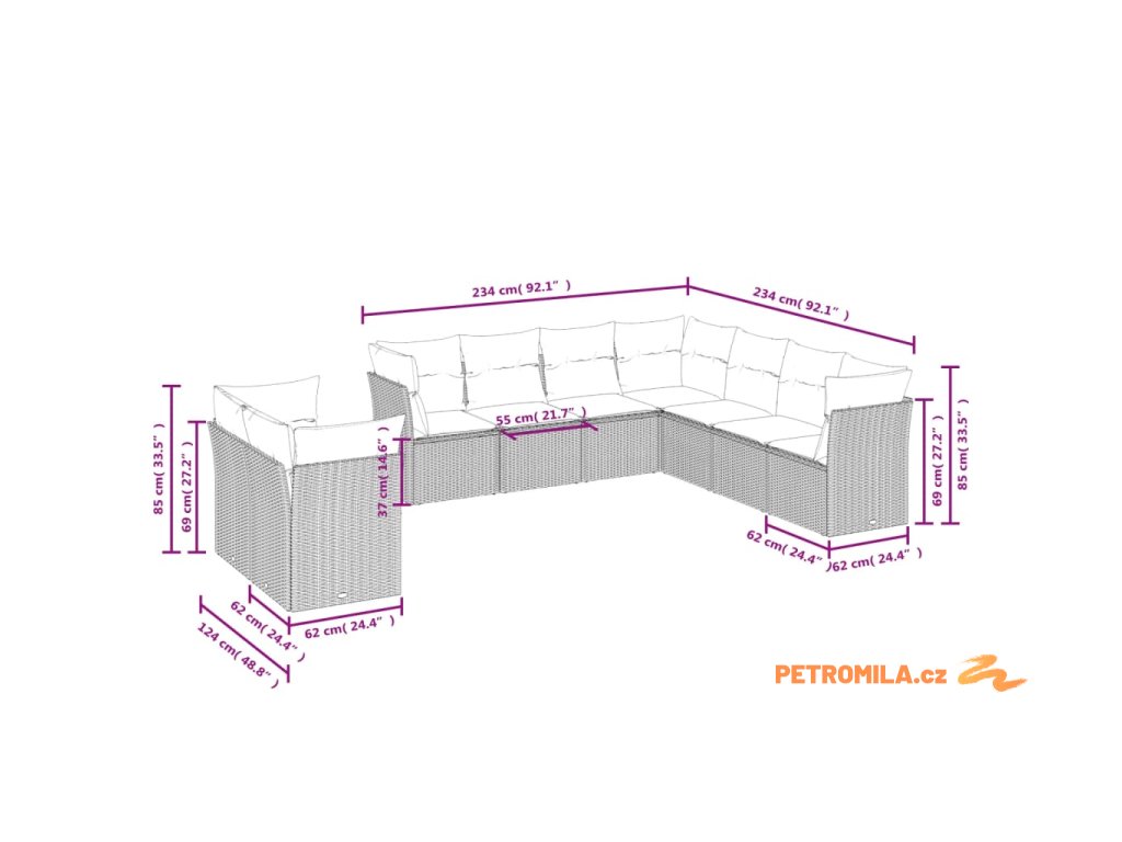 - Celkové rozměry 7místné pohovky: 234 x 234 x 69 cm (Š x H x V)