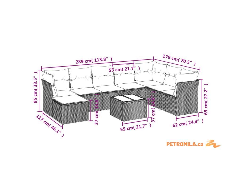 - Celkové rozměry pohovky: 289 x 179 x 69 cm (Š x H x V)