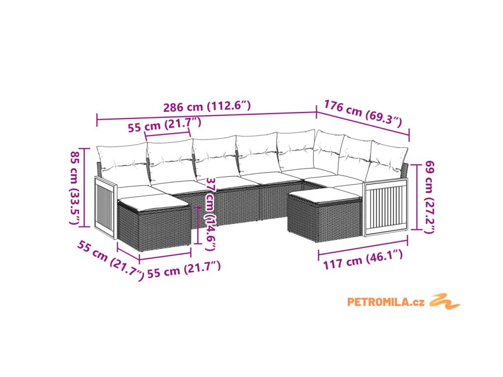 - Rozměry podušky za záda: 55 x 45 x 13 cm (D x Š x T)