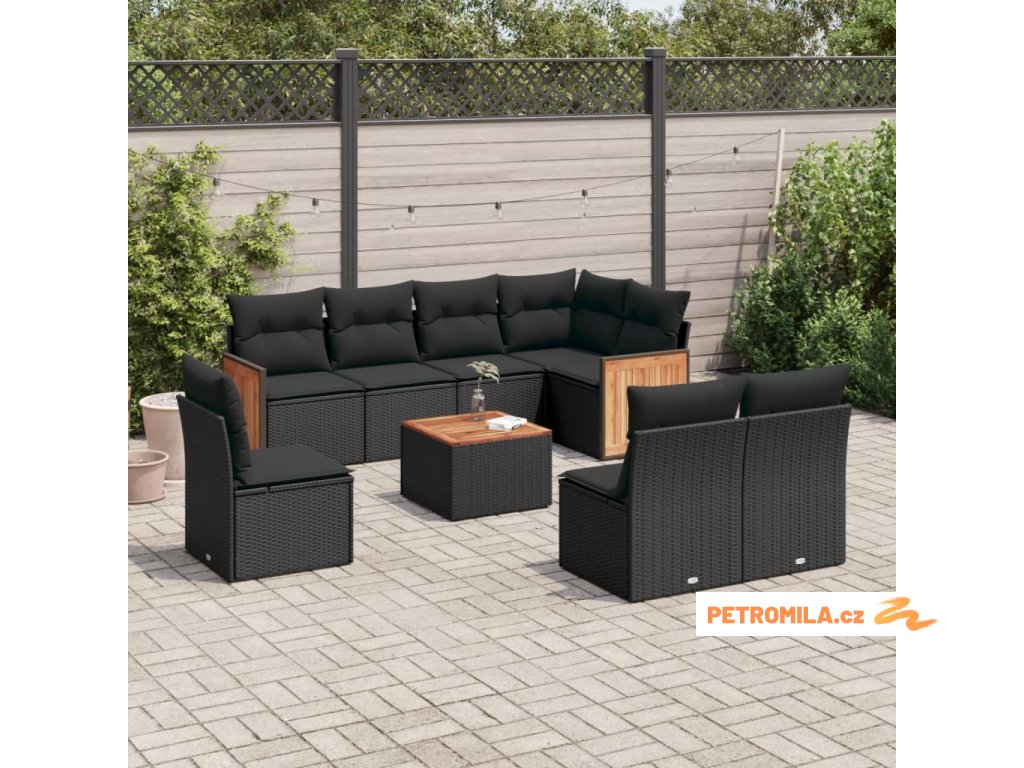 9dílná zahradní sedací souprava s poduškami černá polyratan