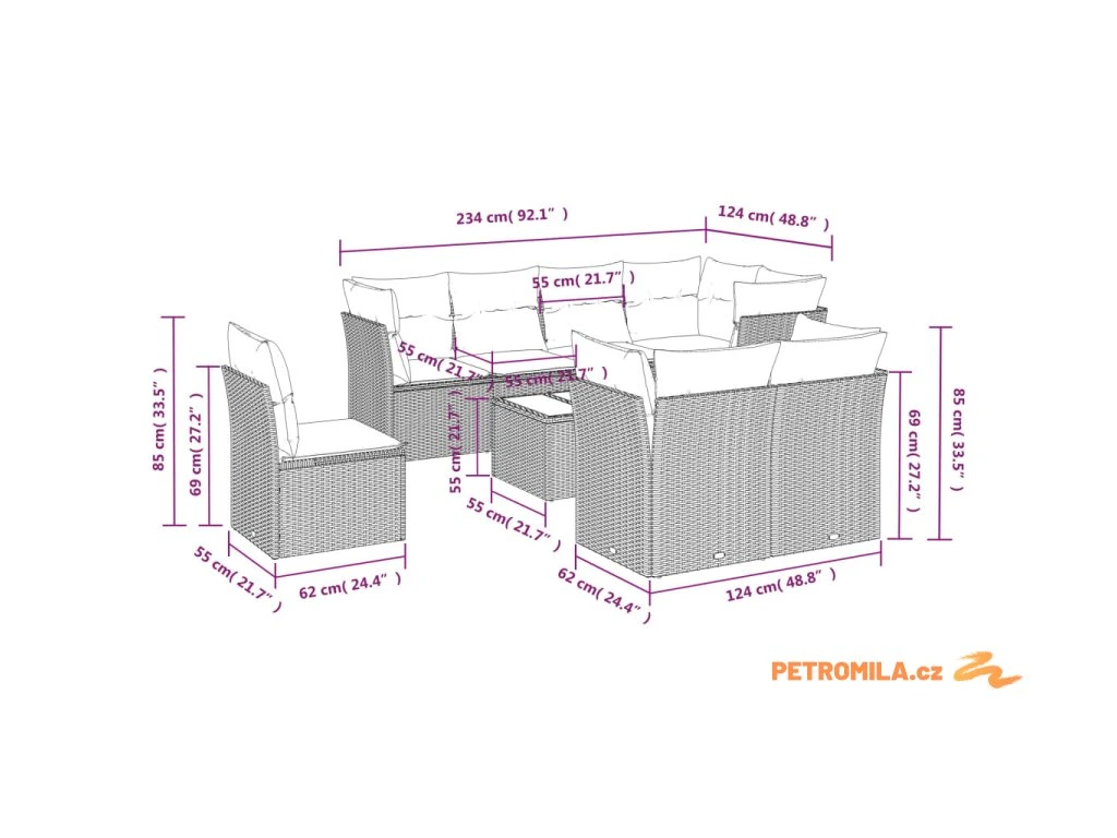 - Celkové rozměry 5místné pohovky: 234 x 124 x 69 cm (Š x H x V)