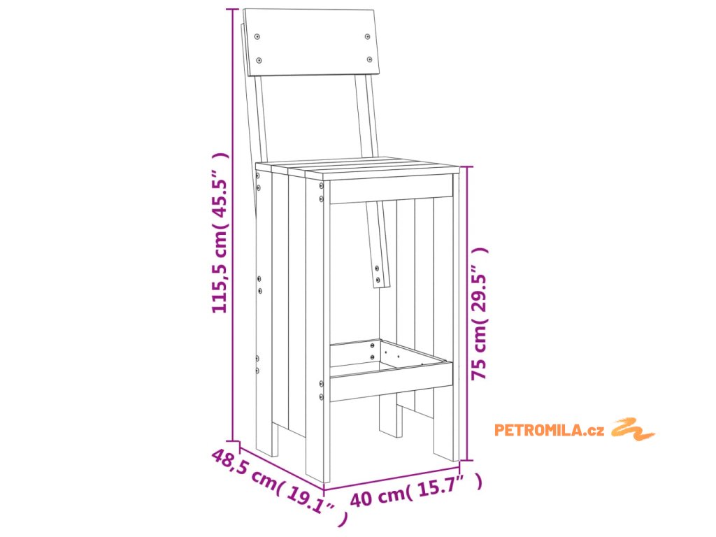 - Rozměry barové stoličky (každý kus): 40 x 48,5 x 115,5 cm (D x Š x V)