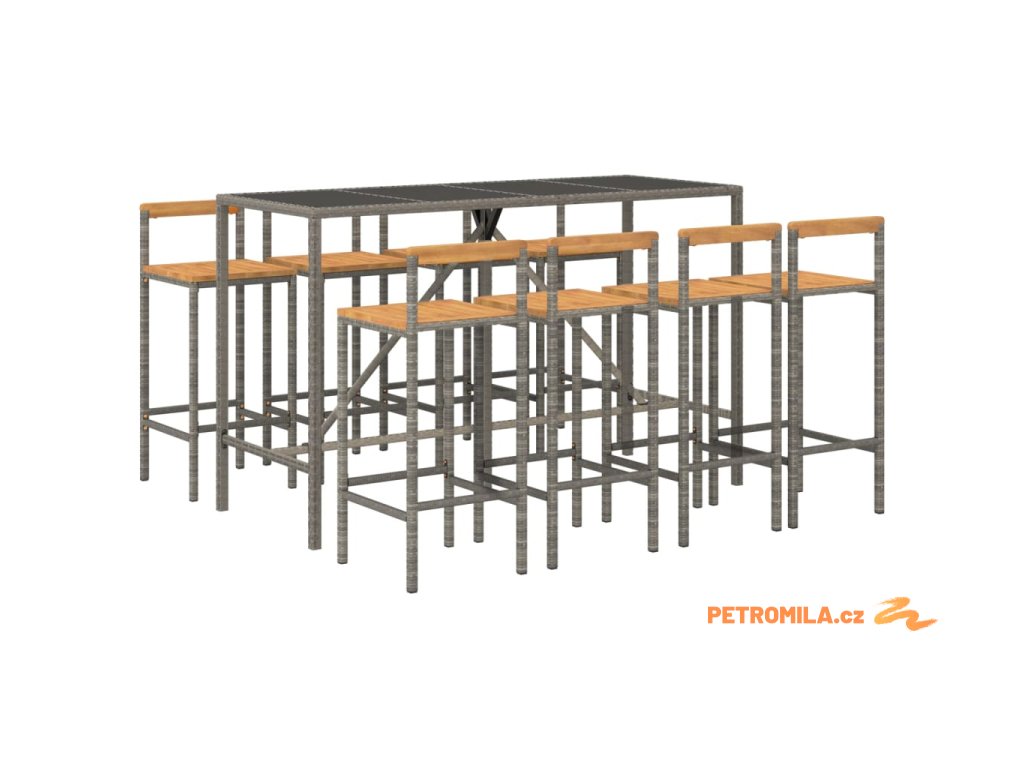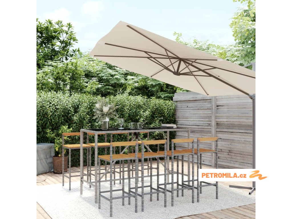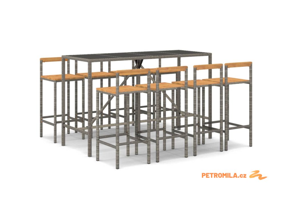 9dílný zahradní barový set šedý polyratan a masivní akácie