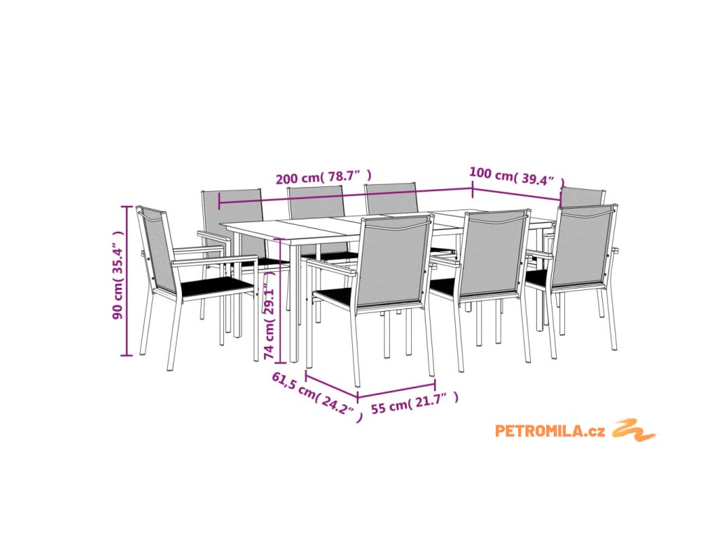 - Rozměry: 200 x 100 x 74 cm (D x Š x V)