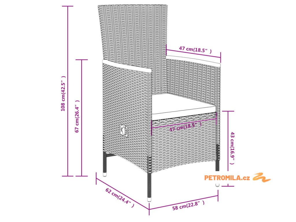 - Rozměry židle (nesklopená): 58 x 62 x 108 cm (Š x H x V)