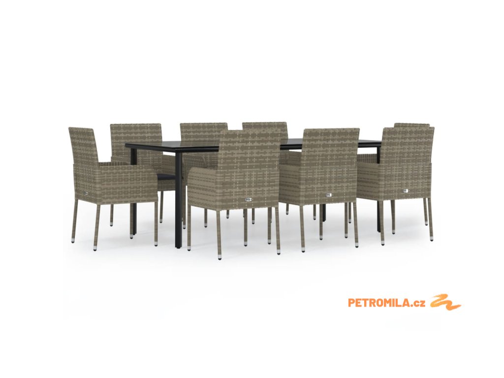 9dílný zahradní jídelní set s poduškami černý a šedý polyratan