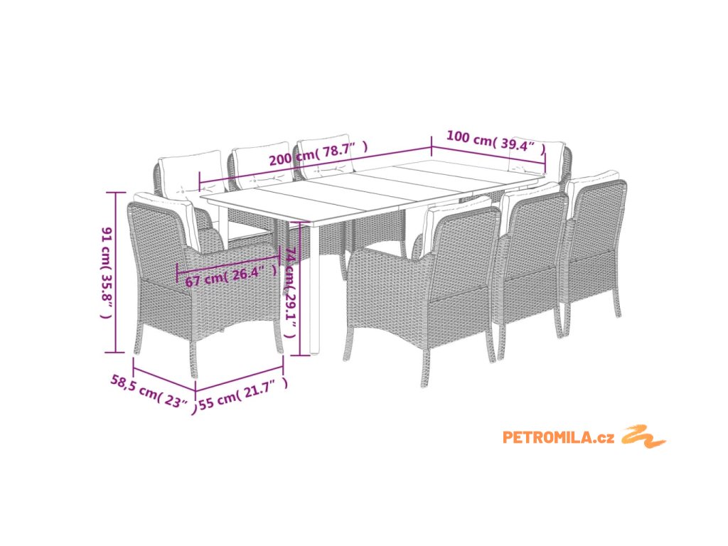 - Rozměry: 200 x 100 x 74 cm (D x Š x V)