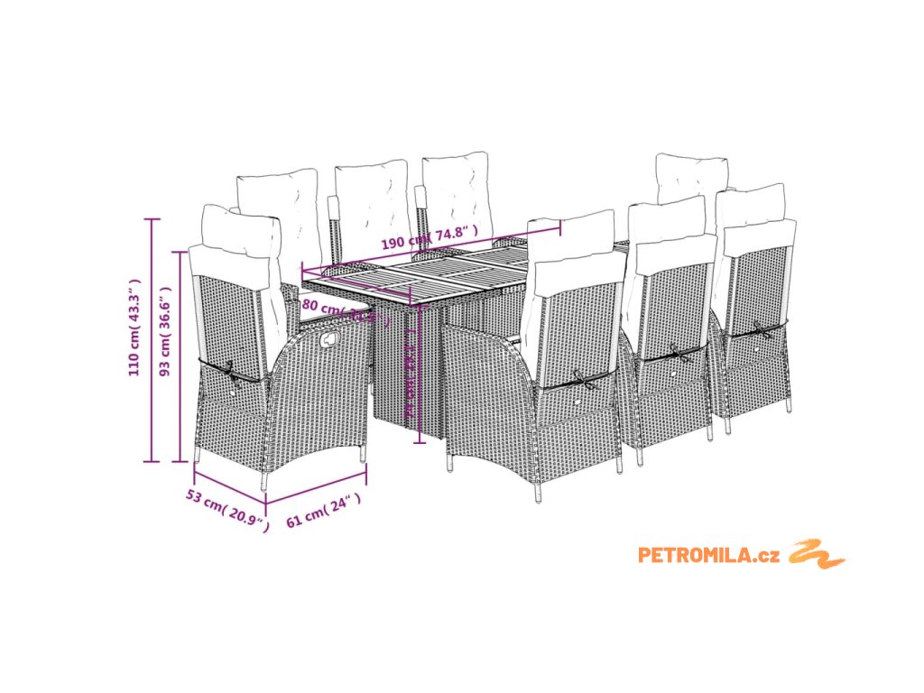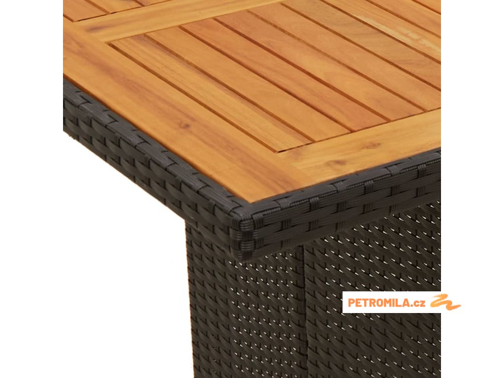 - Materiál: PE ratan, práškově lakovaná ocel, masivní akáciové dřevo s olejovou povrchovou úpravou