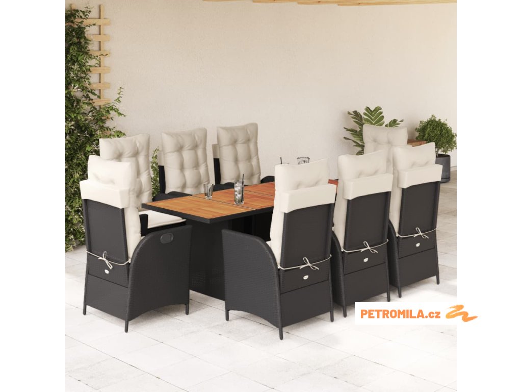9dílný zahradní jídelní set s poduškami černý polyratan