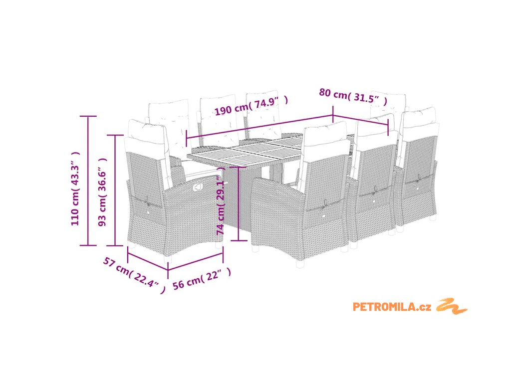 - Rozměry: 190 x 80 x 74 cm (D x Š x V)