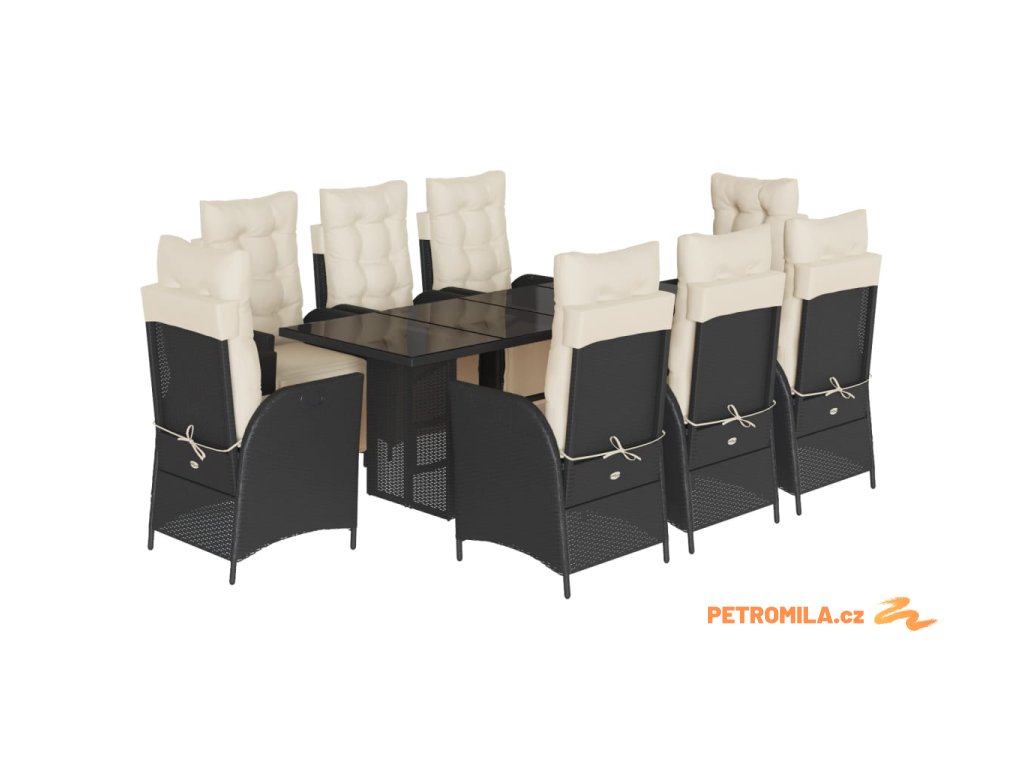 9dílný zahradní jídelní set s poduškami černý polyratan