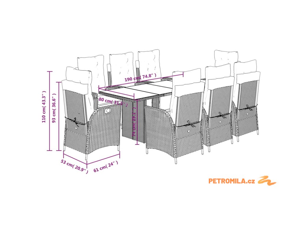 - Rozměry: 190 x 80 x 74 cm (D x Š x V)