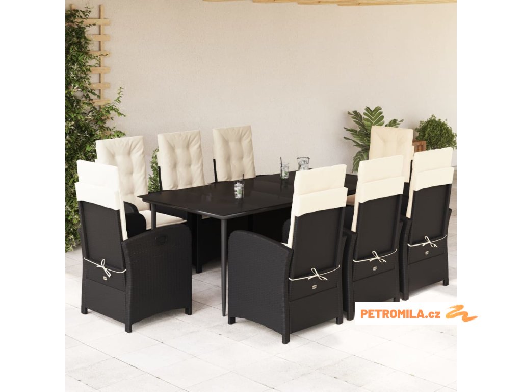 9dílný zahradní jídelní set s poduškami černý polyratan