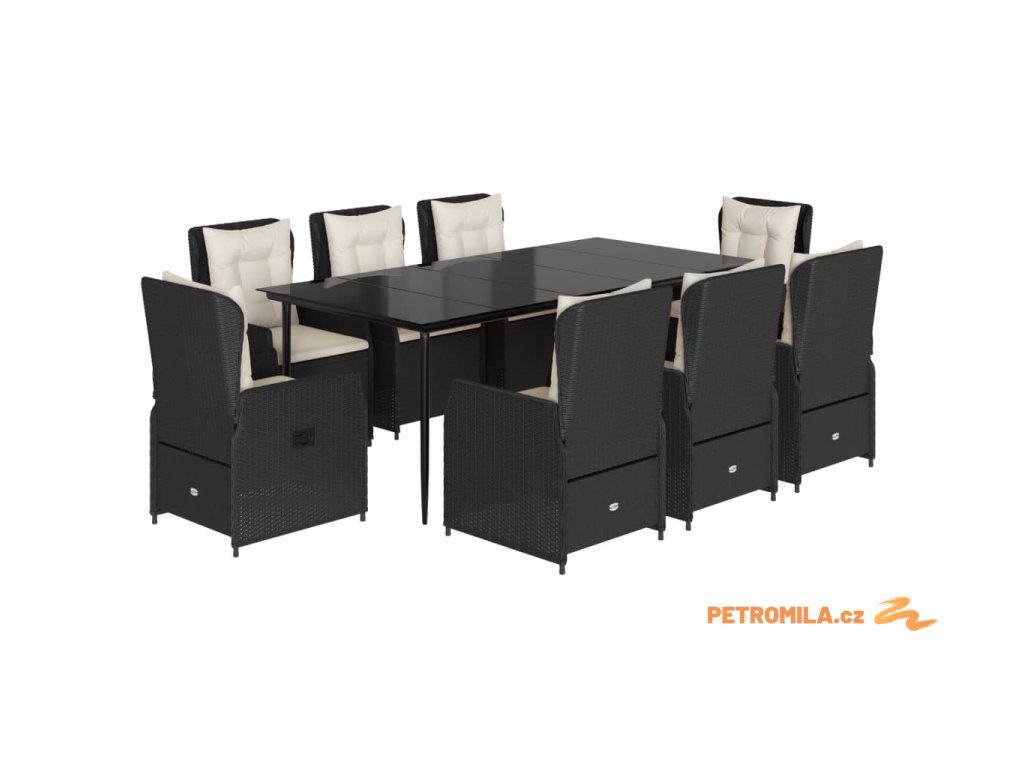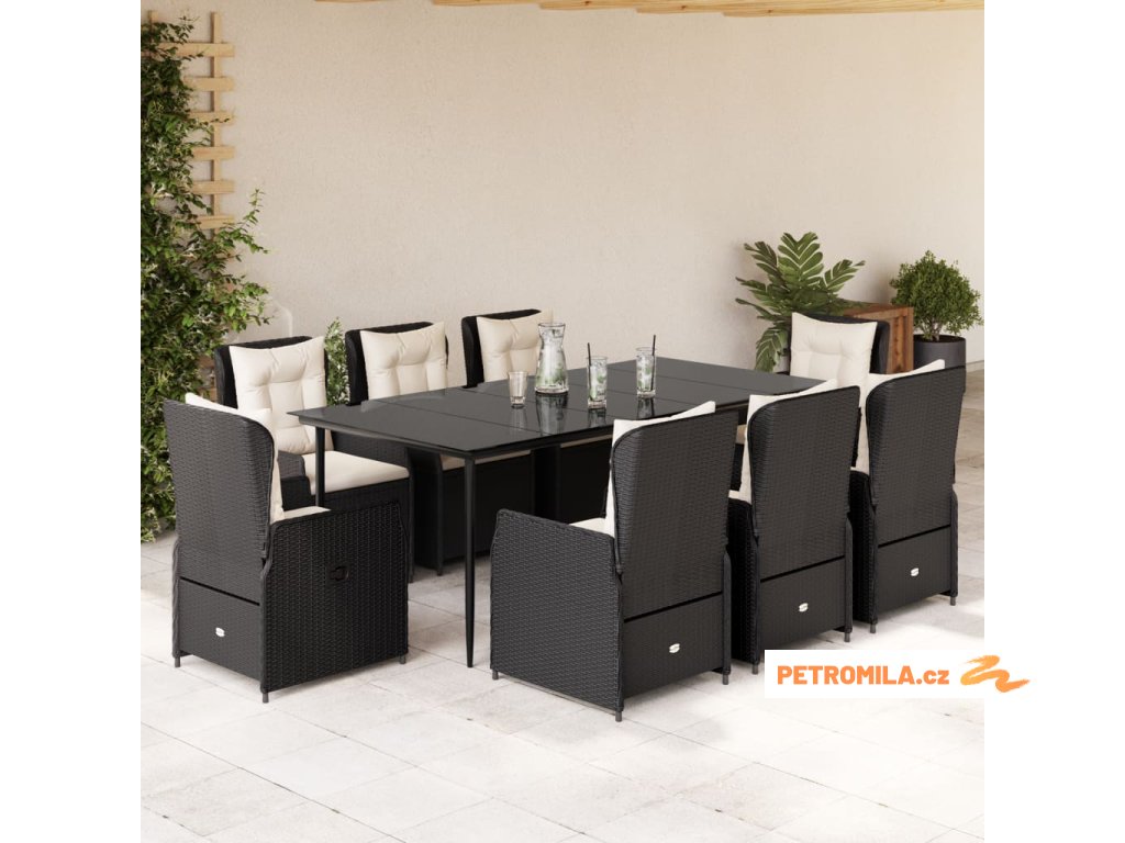 9dílný zahradní jídelní set s poduškami černý polyratan