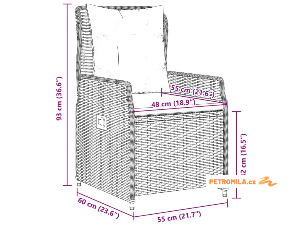 - Rozměry při poloze vsedě: 55 x 60 x 93 cm (Š x H x V)