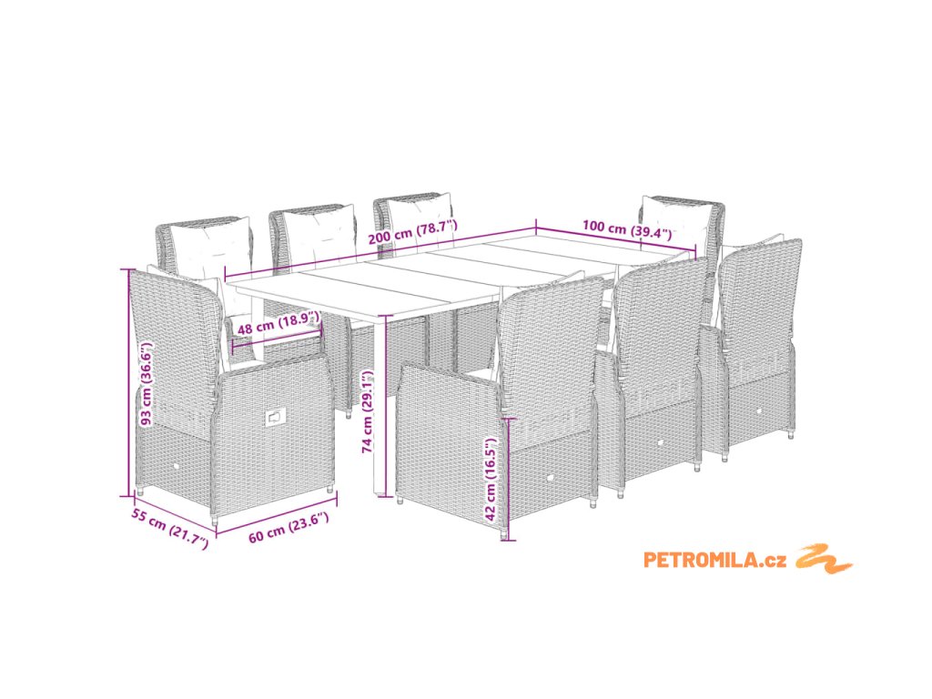 - Rozměry: 200 x 100 x 74 cm (D x Š x V)