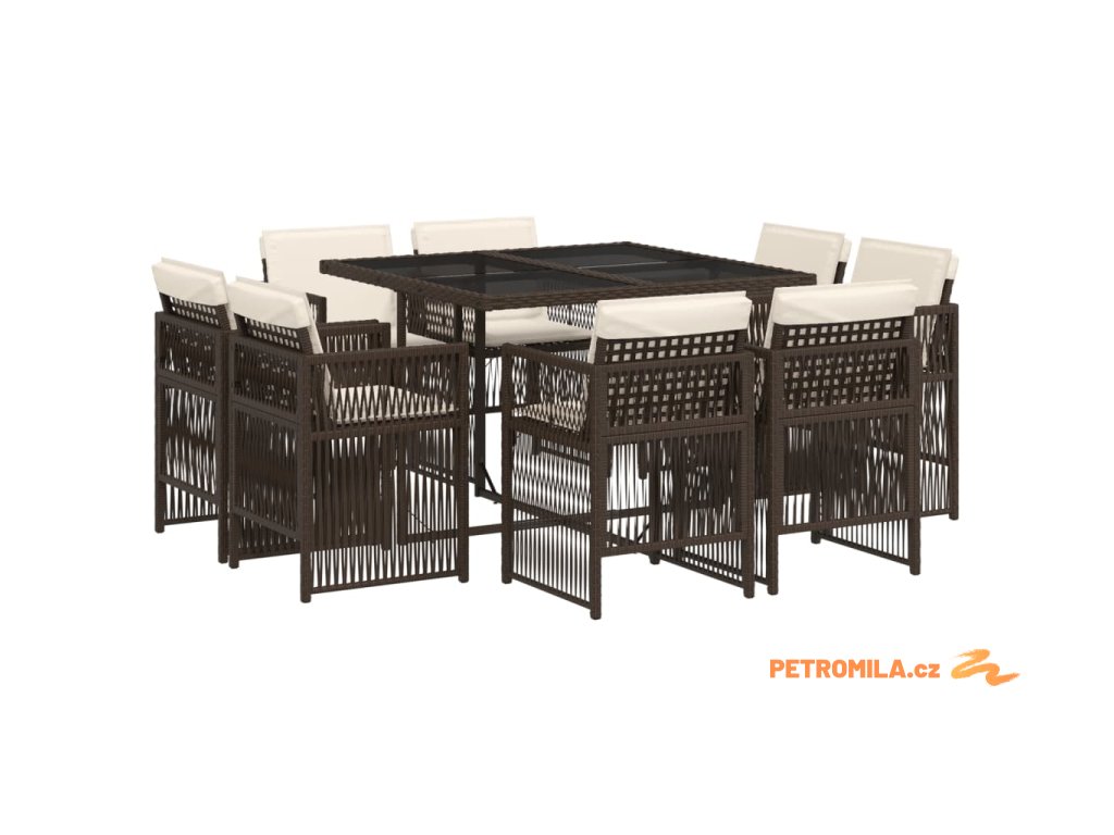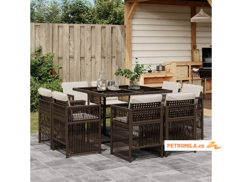 9dílný zahradní jídelní set s poduškami hnědý polyratan