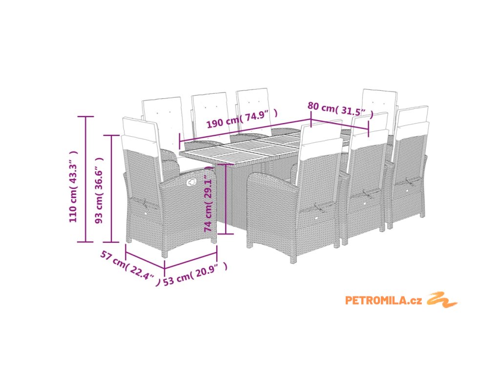- Rozměry: 190 x 80 x 74 cm (Š x H x V)