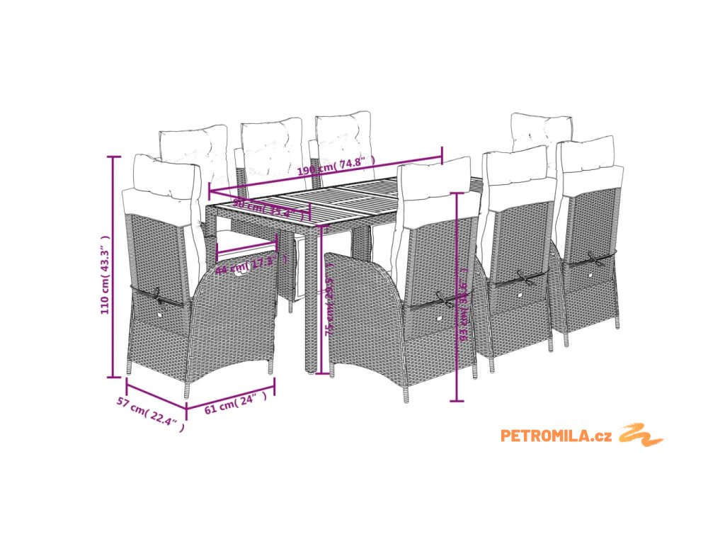 - Materiál: PE ratan, práškově lakovaná ocel, masivní akáciové dřevo s olejovou povrchovou úpravou