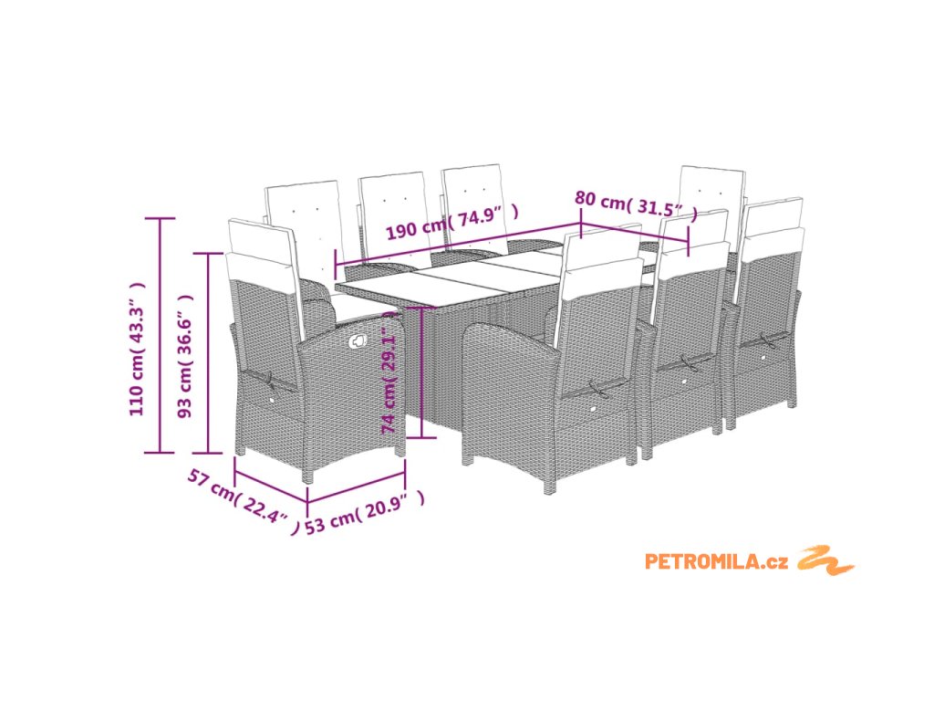 - Rozměry: 190 x 80 x 74 cm (Š x H x V)