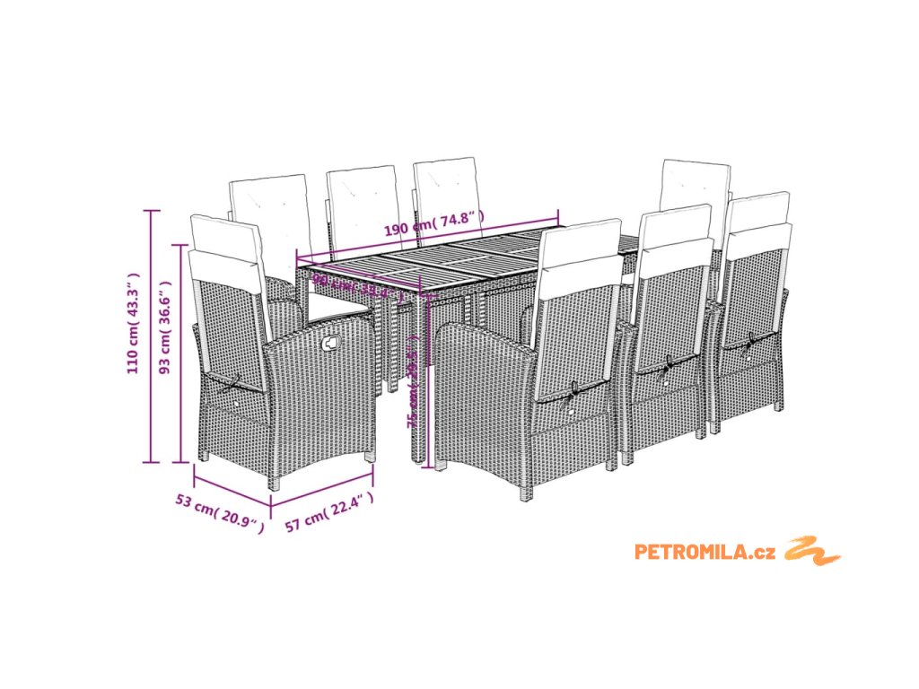 - Materiál: PE ratan, práškově lakovaná ocel, masivní akáciové dřevo s olejovou povrchovou úpravou