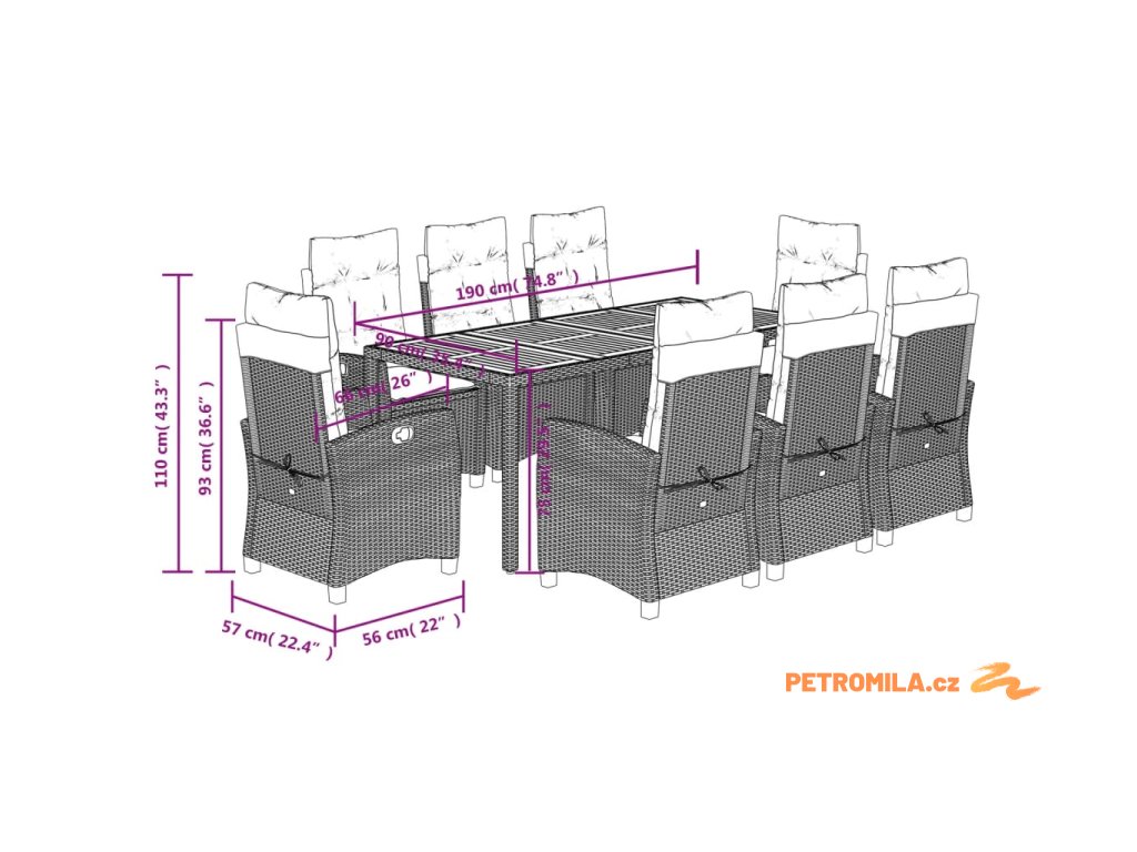 - Materiál: PE ratan, práškově lakovaná ocel, masivní akáciové dřevo s olejovou povrchovou úpravou