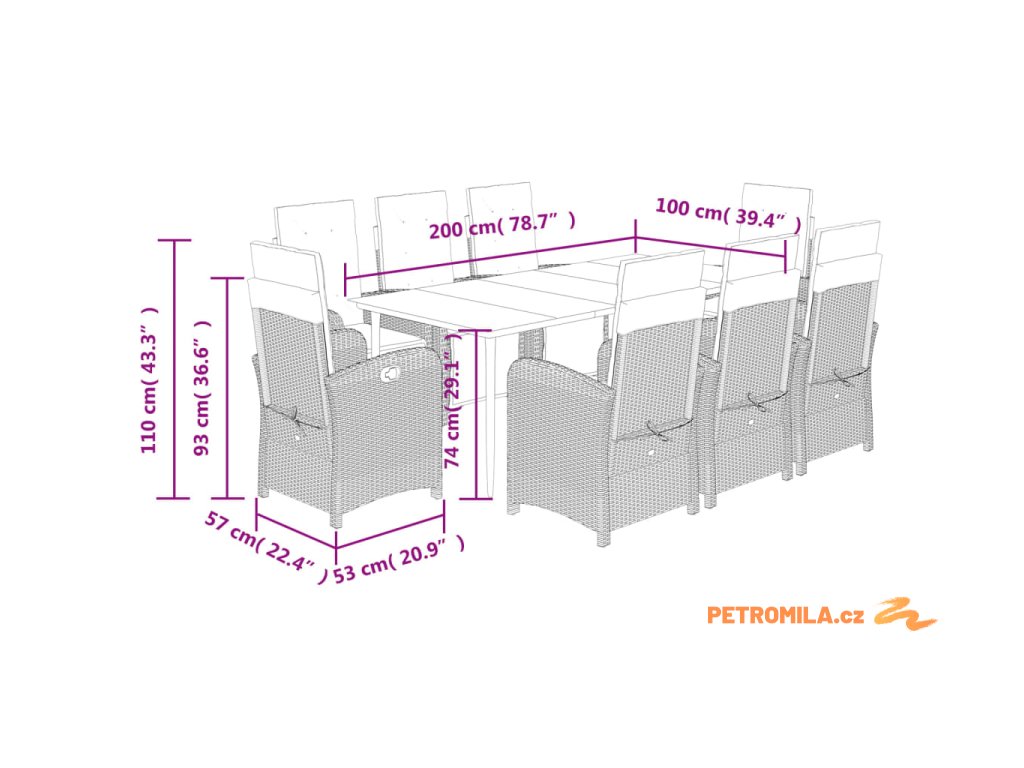 - Rozměry: 200 x 100 x 74 cm (D x Š x V)