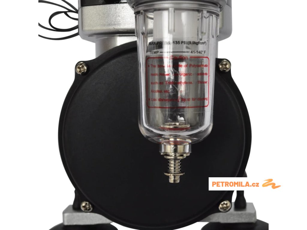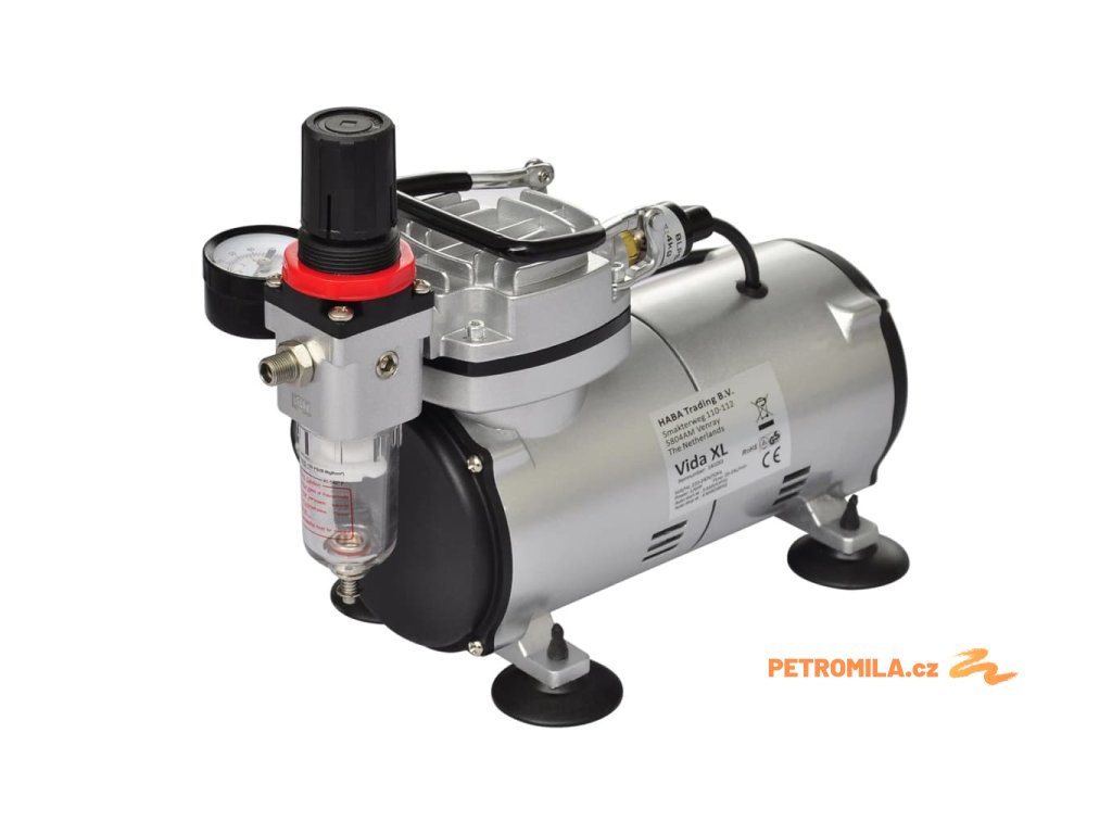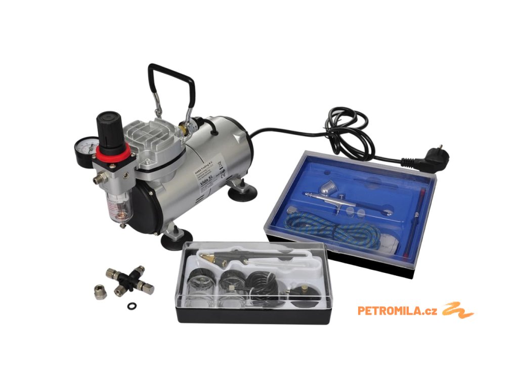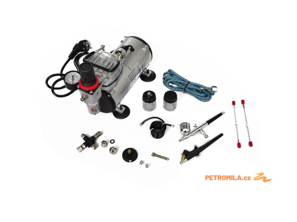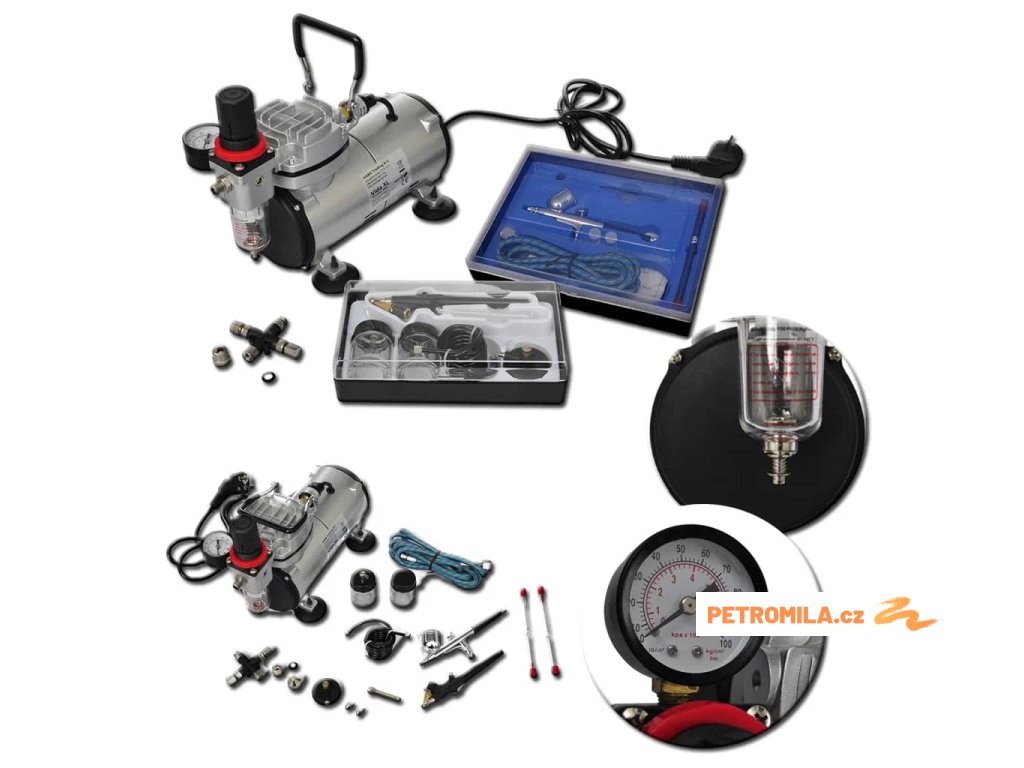 Tento bezolejový pístový kompresor s regulací vzduchu, vzduchovým filtrem a manometrem je vhodný pro všechny typy airbrush s tryskou o velikosti 0,2 až 1,0 mm.