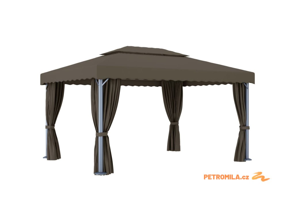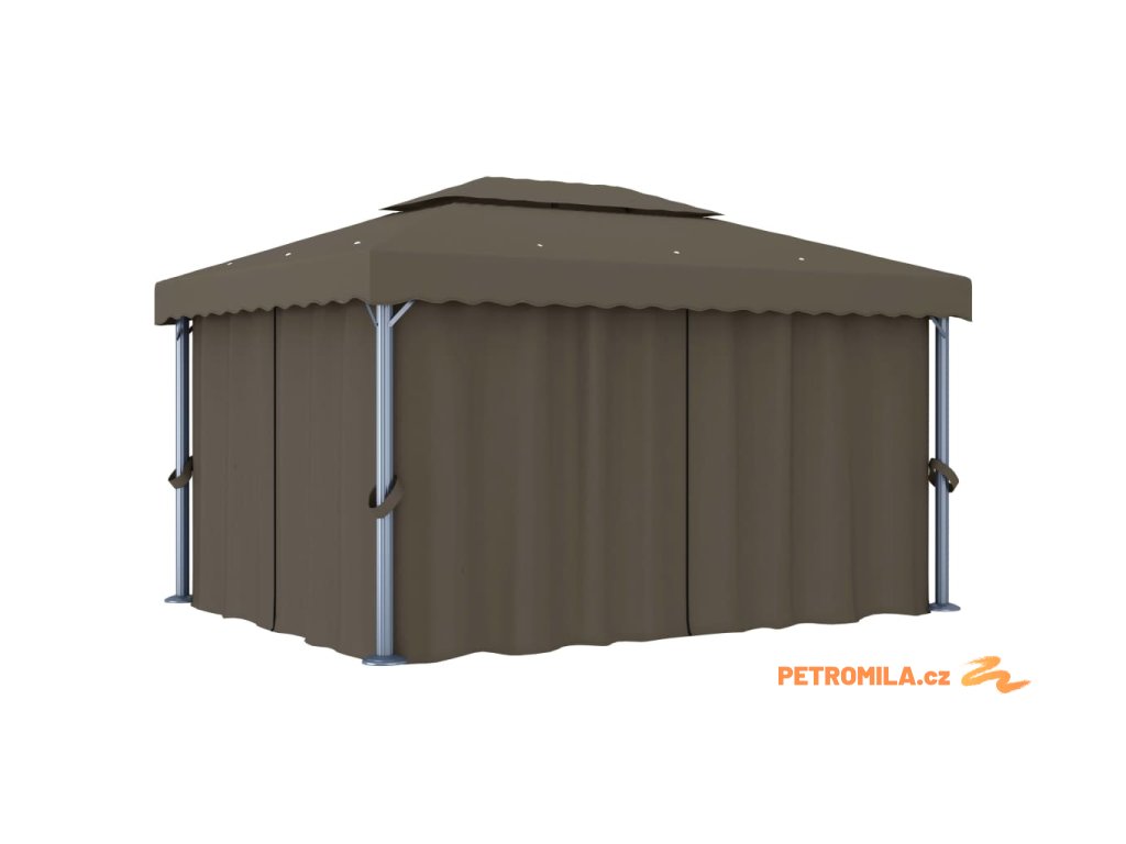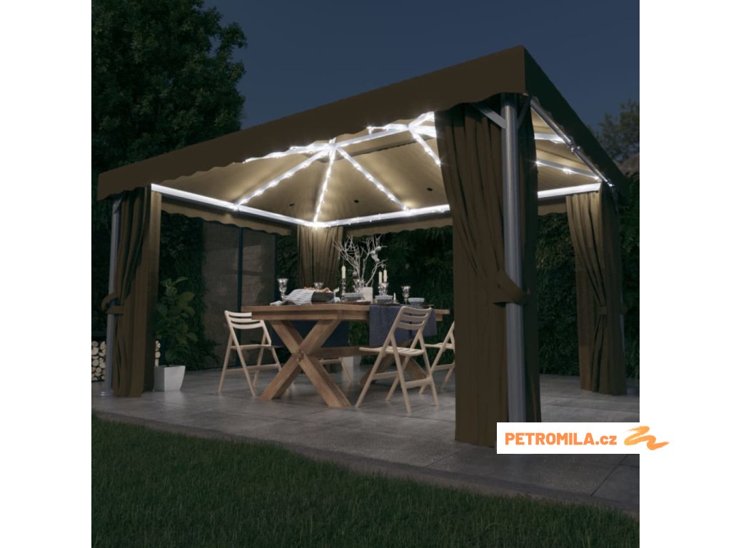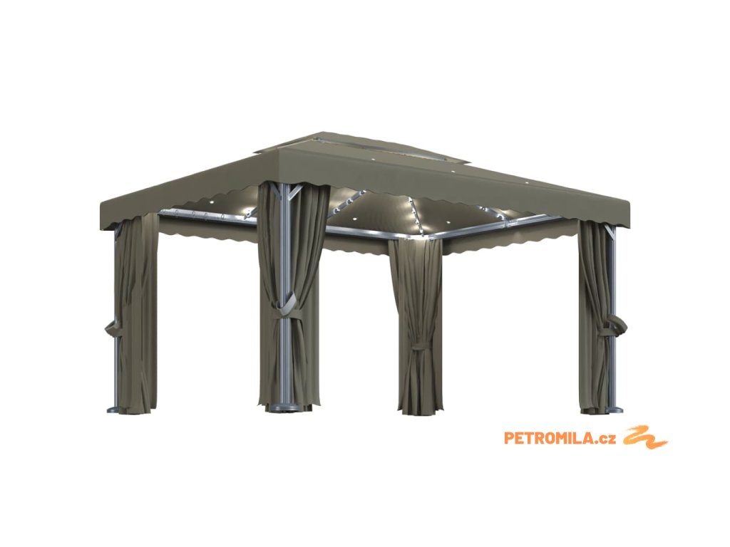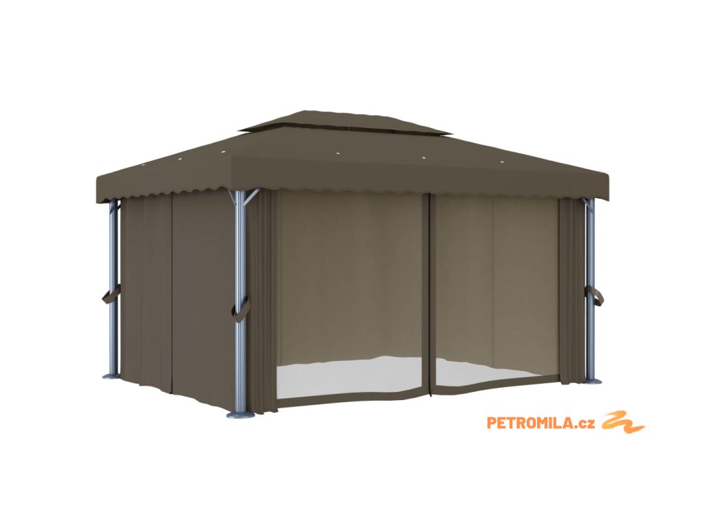 Altán se závěsy a světelnými LED řetězy 4 x 3 m taupe