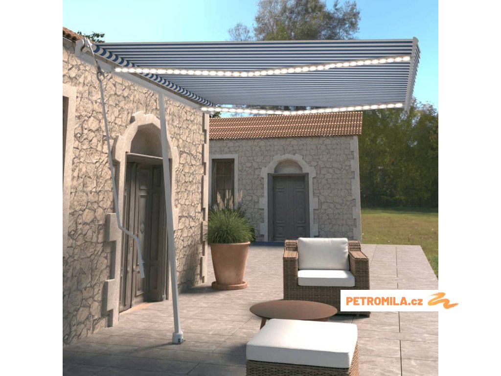 Automatická markýza LED a senzor větru 300 x 250 cm modrobílá