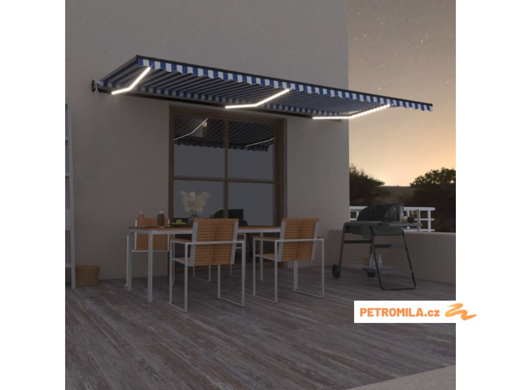 Automatická markýza LED a senzor větru 600 x 350 cm modrobílá