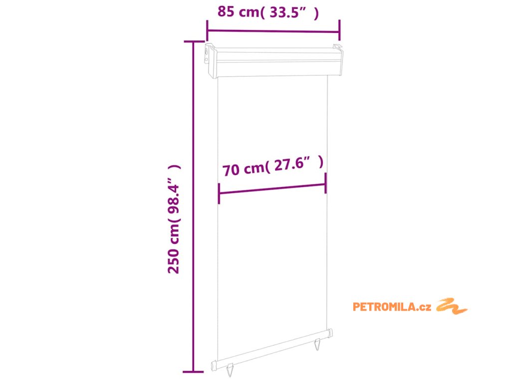 Zástěna je vyrobená z polyesteru, který je odolný jak vůči UV záření, tak proti roztržení. Hliníková rolna zajišťuje hladké vysouvání. Má samosvornou funkci, takže ji můžete zastavit na jakémkoli místě. Délku lze nastavit až do 250 cm. Boční markýza se dá automaticky stáhnout zpět do ocelové kazety pouhým zatažením za spodní trojúhelníkové kroužky. Navíc umožňuje flexibilní upevnění buď na stěnu, nebo na strop podle konkrétních potřeb.