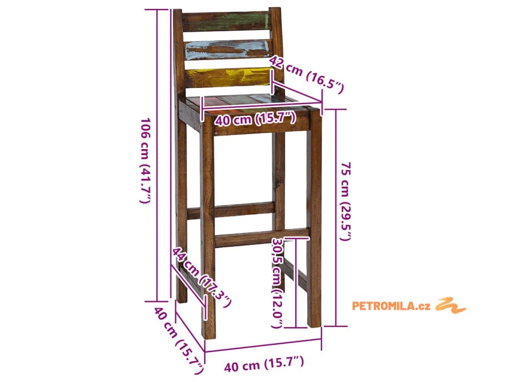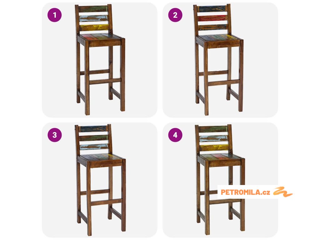 Barové židle jsou vyrobeny z masivního recyklovaného dřeva, které pochází ze starých rybářských lodí a obsahuje různé typy dřeva, jako je dřevo mindi (bílý cedr), akácie, pobřežní ibišek apod. To znamená, že recyklované dřevo má charakteristiky všech těchto různých druhů dřevin. Navíc je již zestárlé, zvětralé a vyschlé, takže se nesmršťuje ani neohýbá. Známky opotřebení a zřetelná kresba dřeva dávají setu jeho vlastní příběh a unikátní vzhled. Každá fáze výrobního procesu byla provedena s největší pečlivostí, ať už se jedná o leštění, natírání nebo lakování. Montáž barových stoliček je snadná. Balení obsahuje 2 barové stoličky.