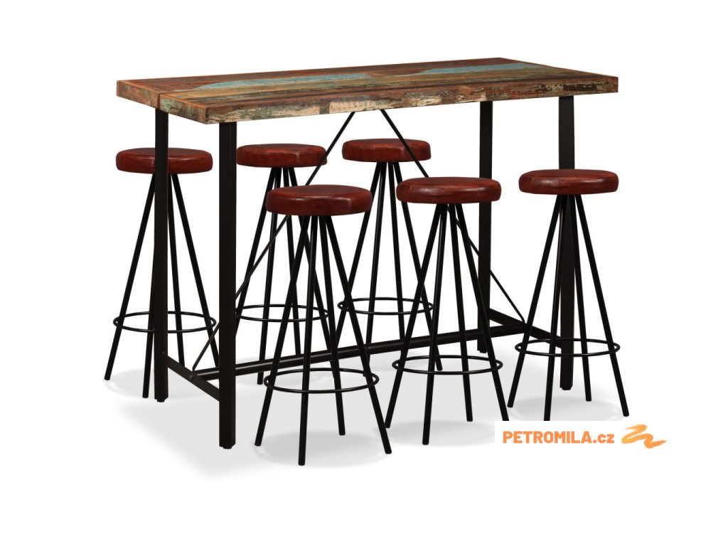 Barový set 7 kusů masivní recyklované dřevo a pravá kůže