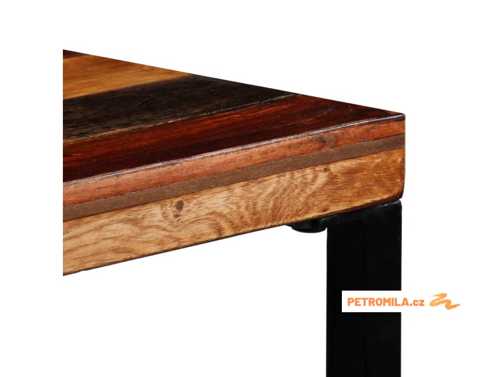 Barový stůl má pevnou a odolnou horní desku, která je vyrobená z masivního recyklovaného dřeva. Recyklované dřevo pochází z trámů, podlah a podpěrných nosníků ze starých budov určených k demolici. Může se tedy skládat z různých typů dřeva, jako jsou borovice, teak, buk, dub, cedr, mangovník, akácie atd. To znamená, že recyklované dřevo má charakteristiky všech těchto rozličných druhů dřevin. Navíc je již zestárlé, ošlehané a vyschlé, takže se nesmršťuje ani neohýbá. Barevný kontrast jednotlivých druhů dřeva dává stolu jedinečný vzhled a překrásná textura činí každý kus nábytku jedinečným a lehce odlišným od ostatních. Ocelové nohy přispívají k pevnosti a stabilitě stolu a zároveň podtrhují jeho industriální šarm.