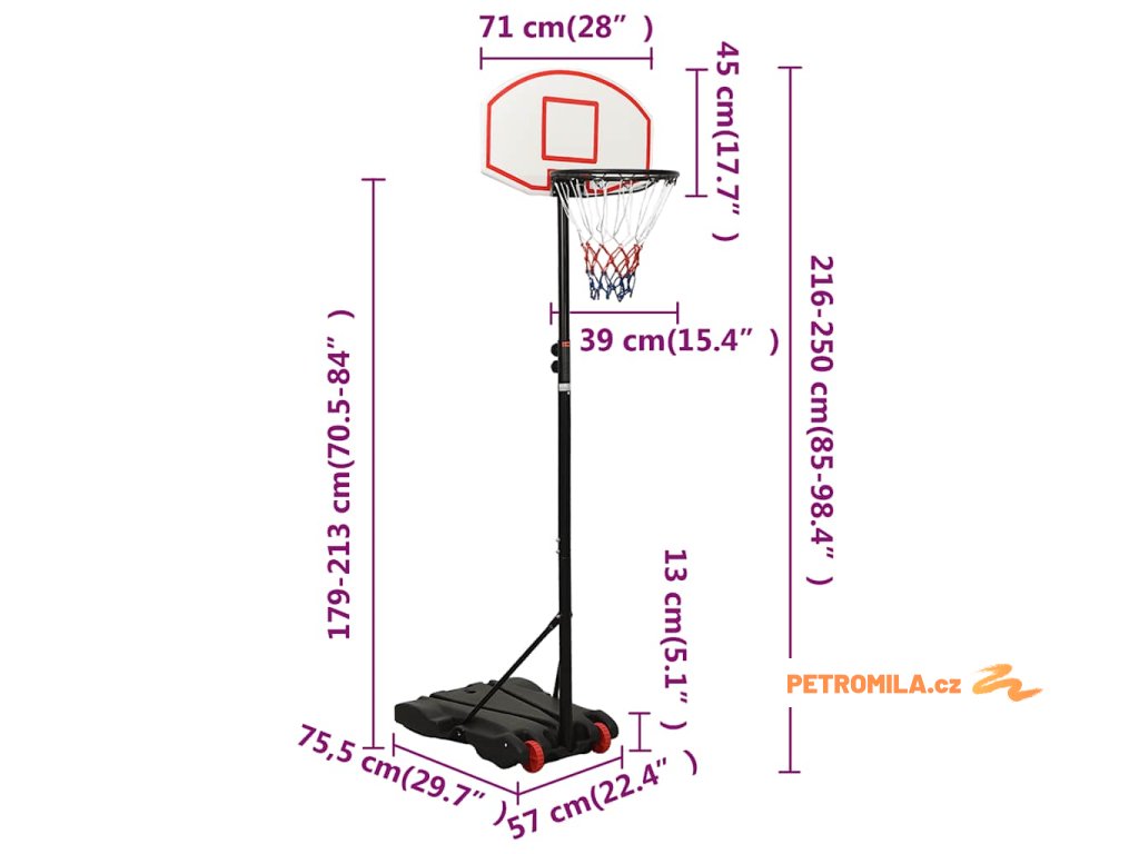 - Nastavitelná výška: Stojan na basketbalový koš má nastavitelnou výšku a lze jej natáhnout tak, aby vyhovoval různým hráčům. Tento basketbalový stojan lze nastavit na výšku od 216 cm do 250 cm.