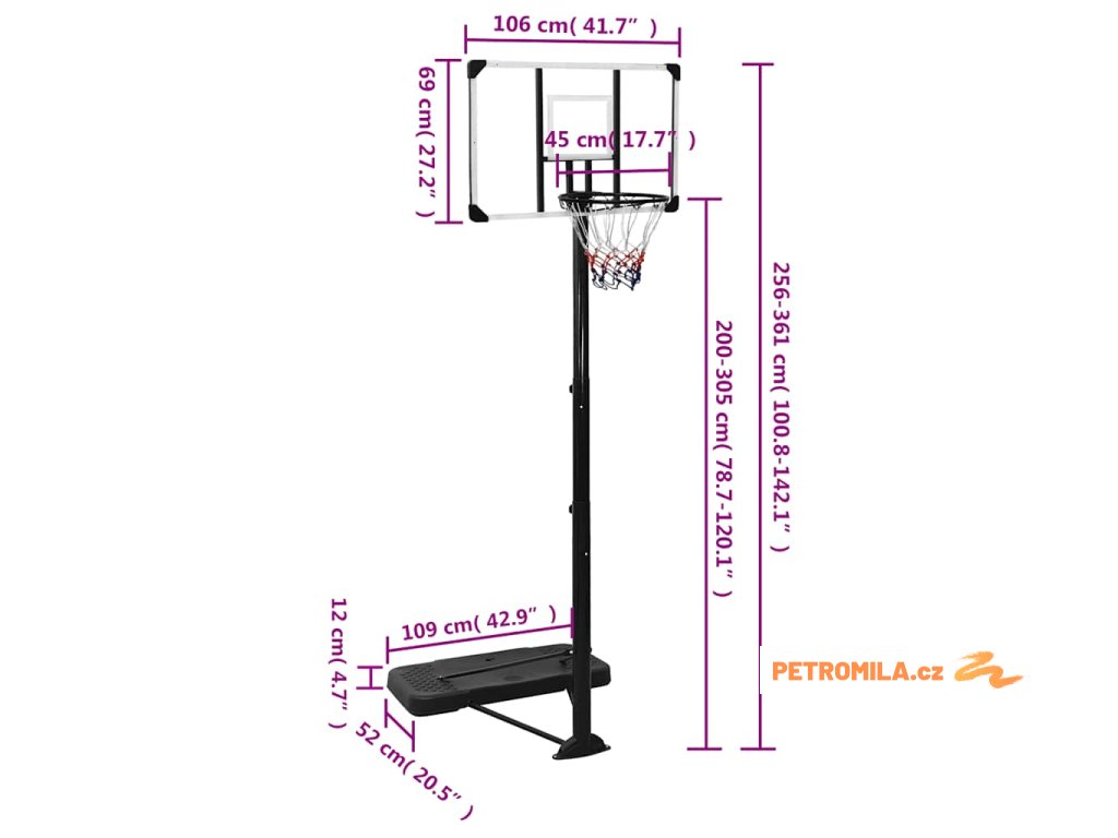 Basketbalový koš s průhlednou deskou 256–361 cm polykarbonát