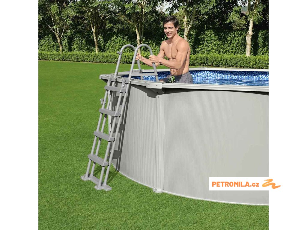 - Bezpečnostní bazénový žebřík: Přiložený bezpečnostní žebřík má schody, které se dají složit, aby se zabránilo malým dětem ve vstupu do bazénu a možným nehodám.
