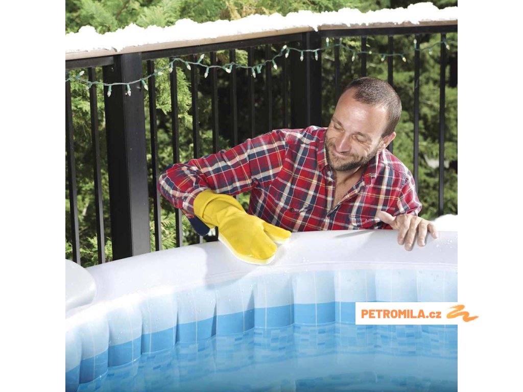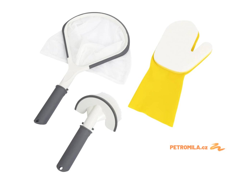 Podběrák má měkký okraj, který chrání povrch vířivky, a design kruhového tvaru, který zapadá do křivek vnitřku vířivky. Hluboká síťka je perfektní ke sběru nečistot a lze ji držet přímo v ruce nebo ji připojit ke standardní teleskopické tyči, potřebujete-li delší dosah. Kartáč je také vybavený měkkým okrajem a má nylonové štětiny, aby při čištění vířivky nedocházelo k poškrábání povrchu. Kartáč je také možné používat ručně nebo se standardní teleskopickou tyčí. Čisticí latexová rukavice je spojená s čisticí houbičkou, se kterou snáze vydrhnete vířivku na úrovni vodní hladiny, aniž by se chemikálie dostaly na vaši pokožku.