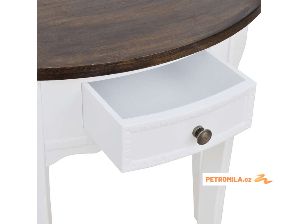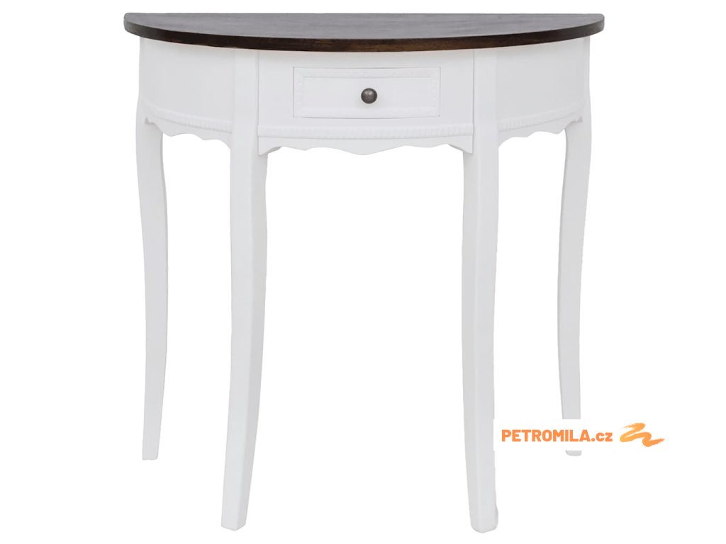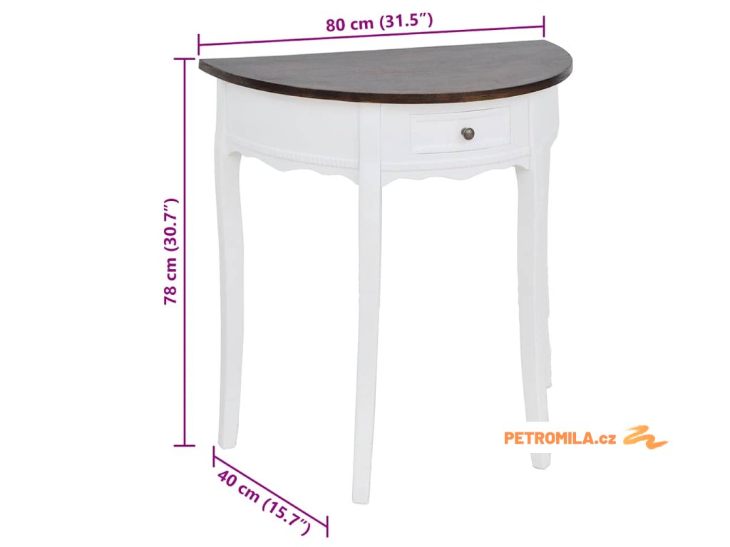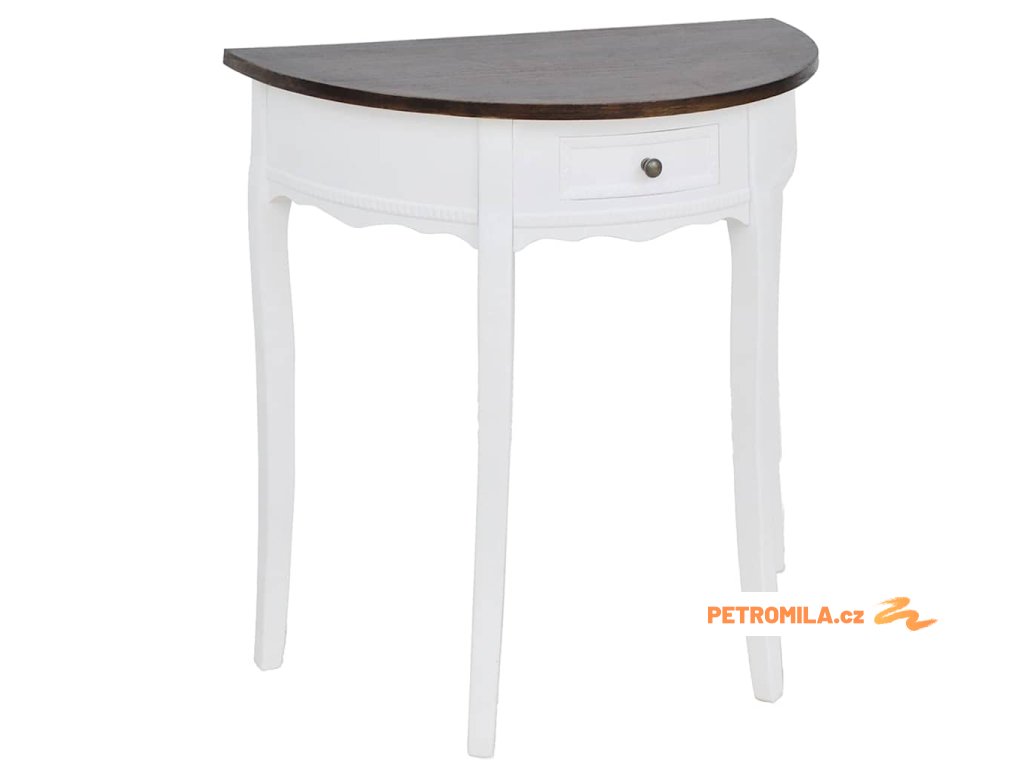 Bílý půlkruhový konzolový stolek se zásuvkou a hnědou deskou