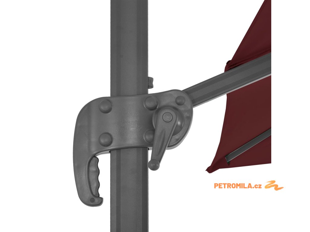 Stříška slunečníku je vyrobená z polyesteru, který nebledne a nepropouští UV záření. Skvěle vás proto ochrání před sluncem a navíc se snadno čistí. Slunečník je opatřen pevnou křížovou základnou pro lepší stabilitu. Pro otevření a zavření stačí otočit páčkou na tyči. Zatlačením nahoru nebo dolů si pak můžete nastavit úhel stříšky. Středovou tyč lze pomocí pedálu otáčet o 360 stupňů. Je vyrobená z robustního hliníku s práškovým nástřikem a opatřena 8 odolnými žebry. Slunečník se díky ní nehýbe a dlouho vydrží.