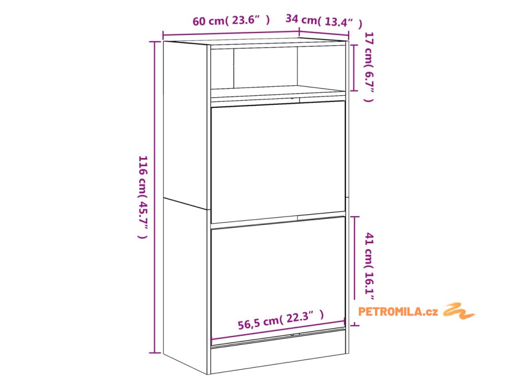 - Spousta úložného prostoru: Tento botník má 1 polici a 2 výklopné zásuvky, poskytuje tedy dostatek prostoru pro přehledné uspořádání bot, kde je budete mít vždy po ruce.