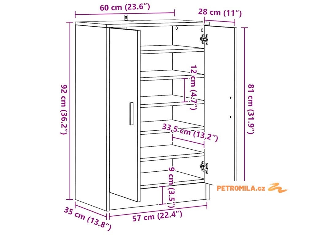 Botník je vyrobený z kvalitního kompozitního dřeva, které mu propůjčuje nejen elegantní vzhled, ale také výtečnou stabilitu a odolnost. Dvířka vám umožní uschovat si obuv hezky uvnitř, kde nebude na očích. Skříňka je navíc poměrně velká a poskytne vám místo na mnoho párů bot.