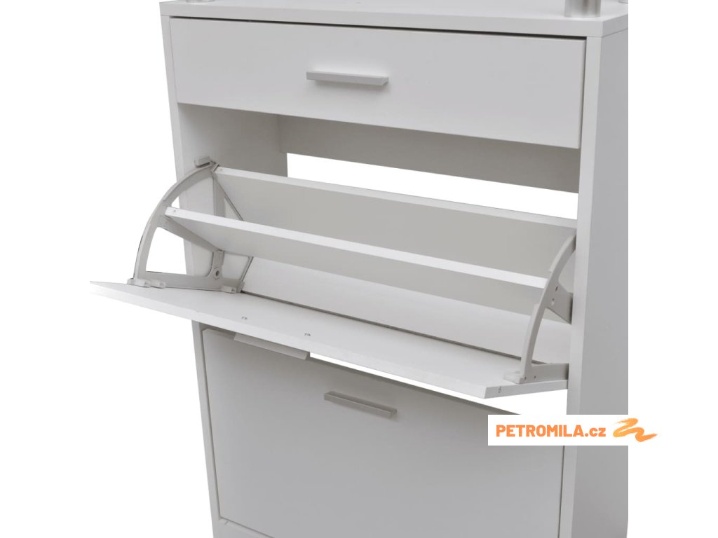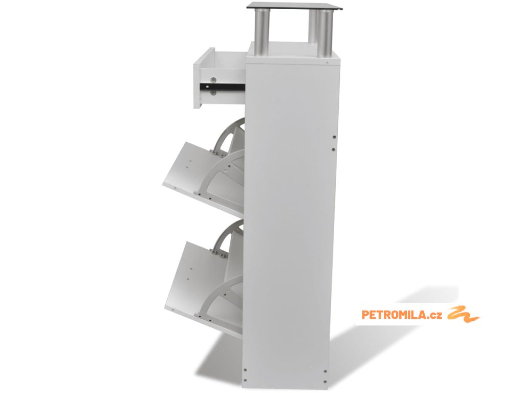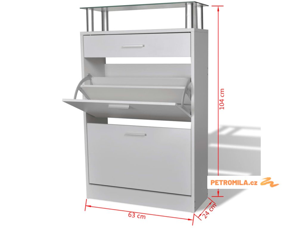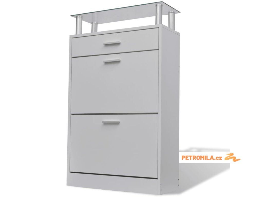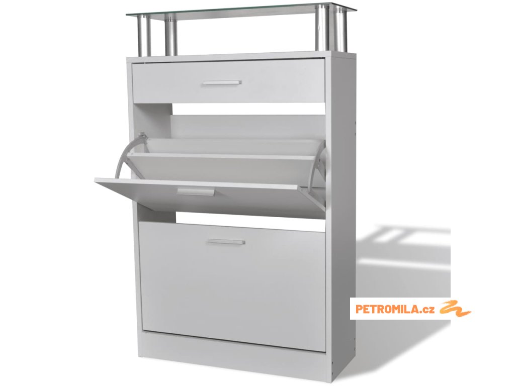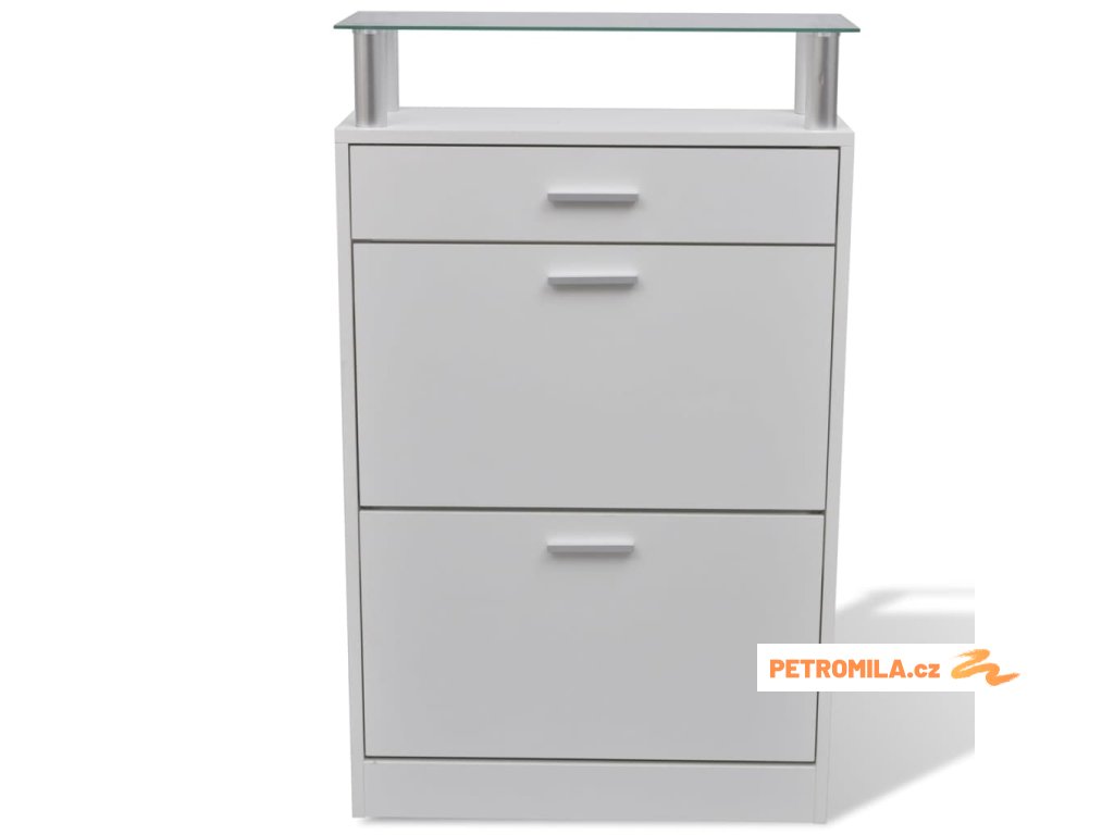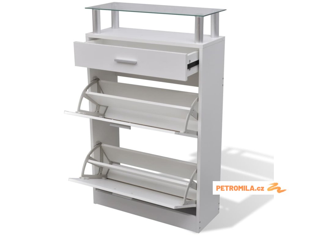 - S 2 velkými přihrádkami na uložení bot, 1 zásuvkou a 1 horní skleněnou policí