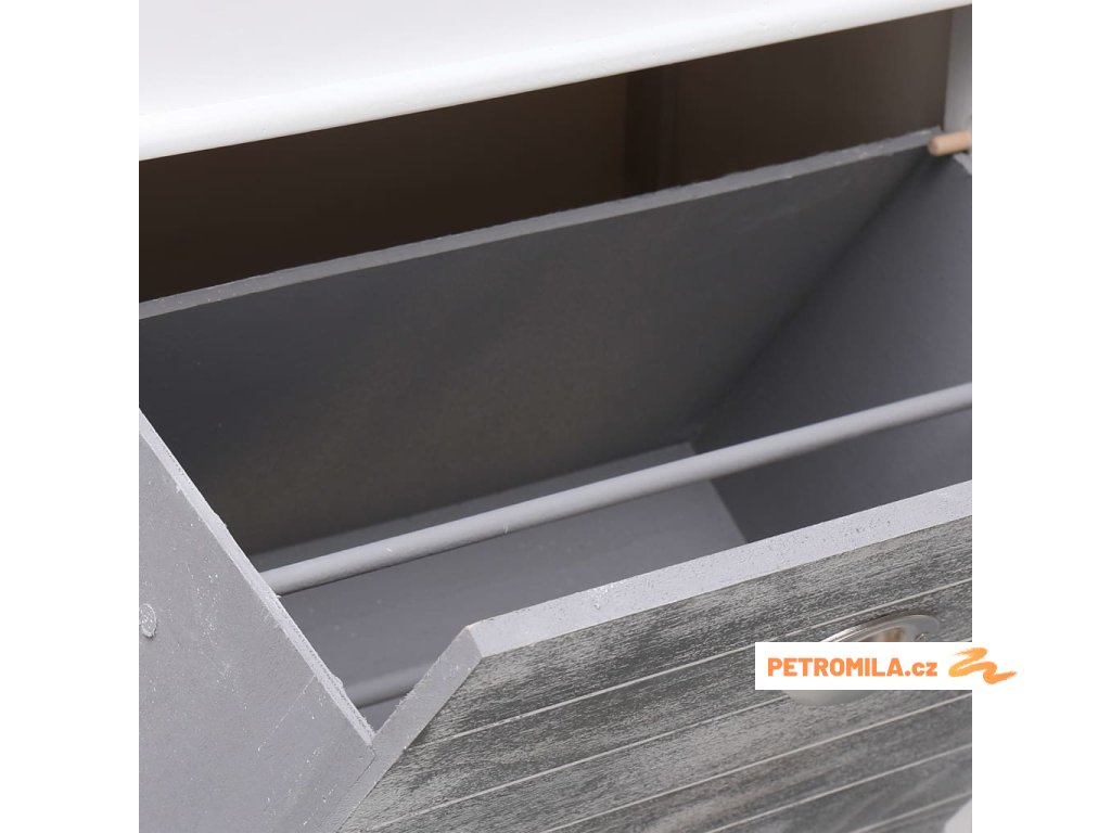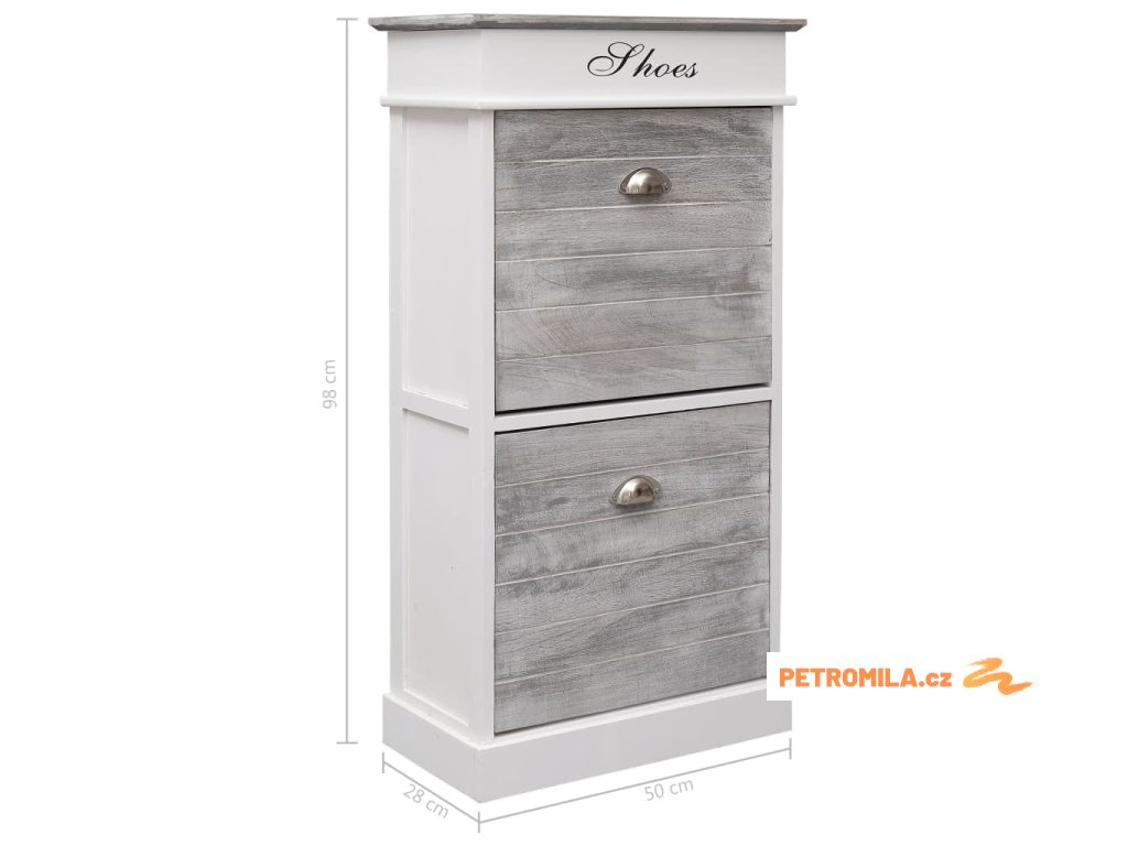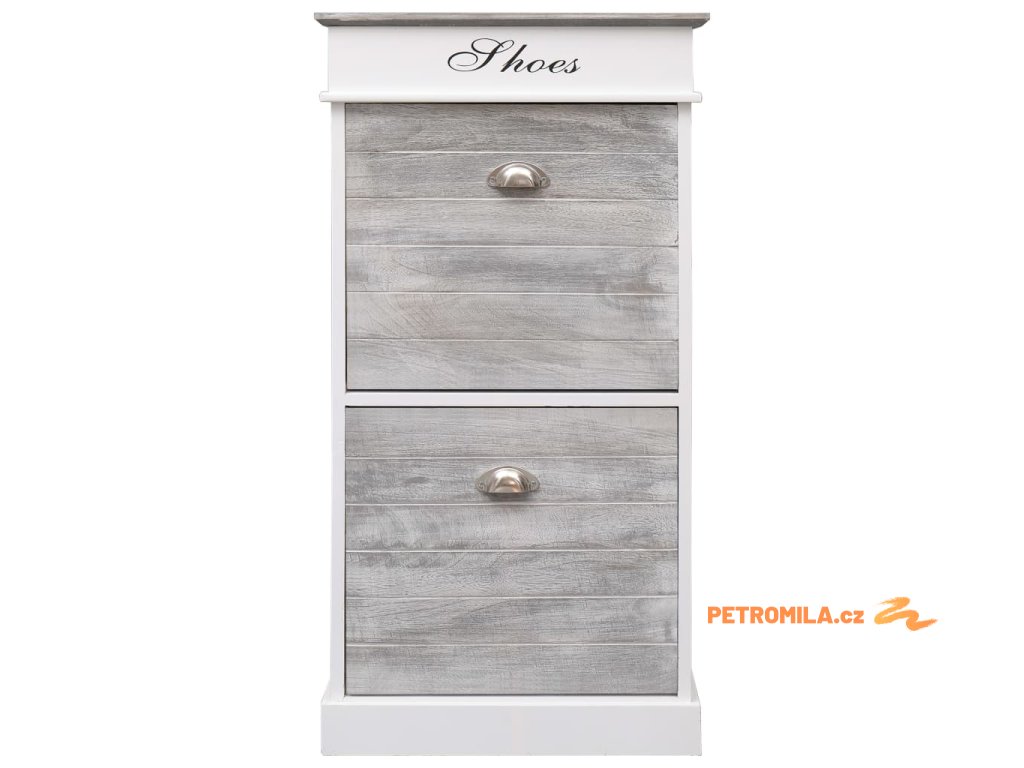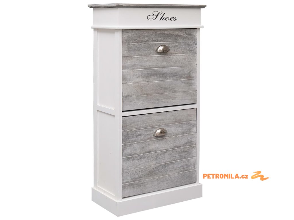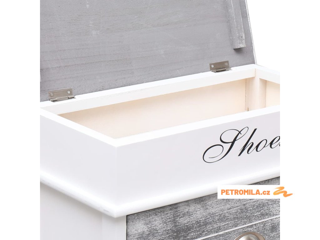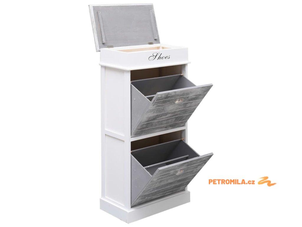 Skříňka je vyrobena ze dřeva pavlovnie, je tedy mimořádně odolná a stabilní. Dvě velké vyklápěcí přihrádky jsou opatřeny příčnými tyčemi, aby vše zůstalo na svém místě. Horní deska botníku se navíc dá odklopit, takže si do horní přihrádky můžete uschovat různé doplňky k obuvi, jako jsou tkaničky, vložky do bot a další maličkosti. Sestavení našeho botníku je snadné.