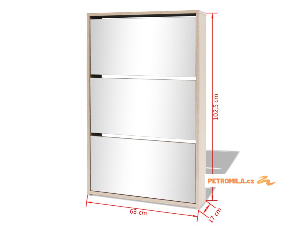Tento zrcadlový botník má tři vyklápěcí přihrádky, z nichž každá pojme 3 až 4 páry obuvi. Botník se montuje přímo na stěnu. Tato pevná a odolná předsíňová skříňka je vyrobena z vysoce kvalitního materiálu a je velmi praktickým kusem nábytku, kde můžete úhledně a stylově ukládat své boty, aby nebyly poházené po bytě.