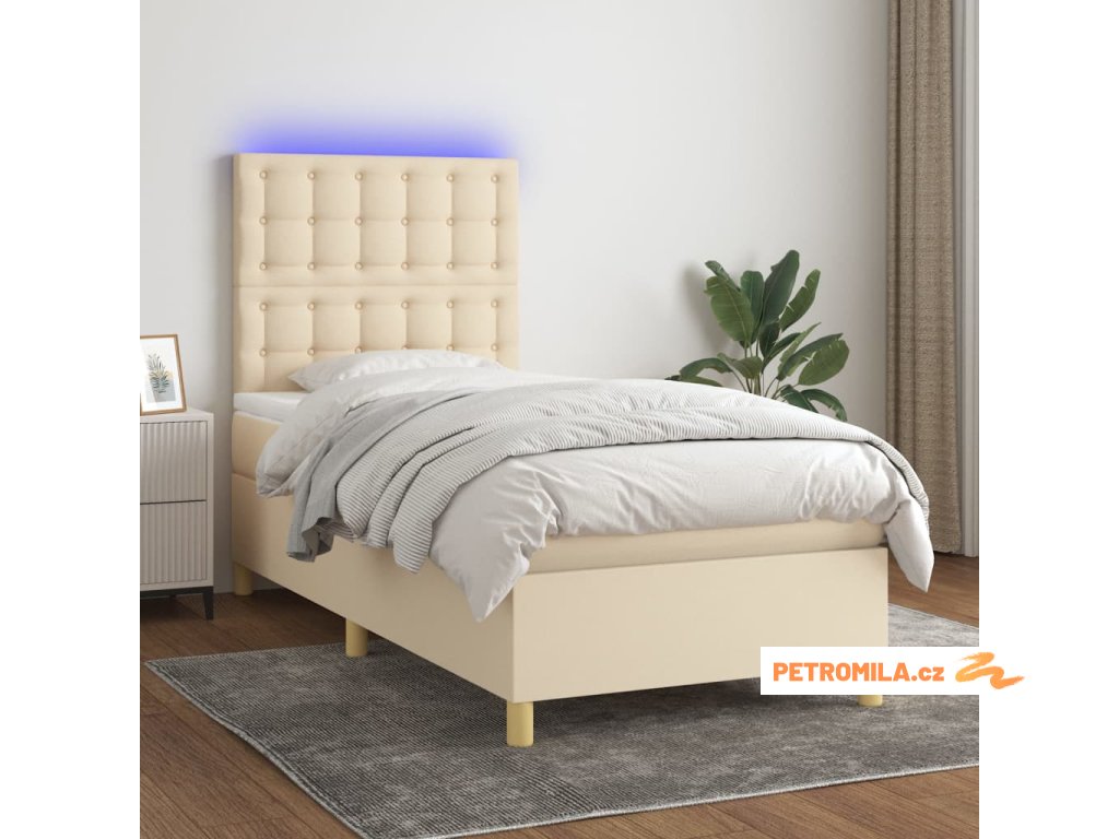 Box spring postel s matrací a LED krémová 90x200 cm textil